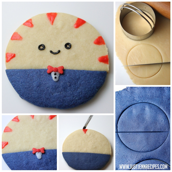 For the lower part (Peppermint Butler’s pants) do the same thing with the blue dough. Roll out it out to 3/8 of an inch and use a 3-1/4″ round biscuit cutter to cut out circles. With a knife, cut off the upper 2/3 of the cookie. That part will be discarded.