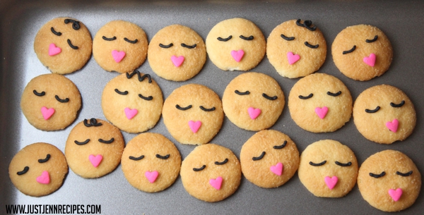 Using a #2 tip, pipe faces using the black frosting onto the Mini Nilla Wafers. Use a heart quin for the mouth.