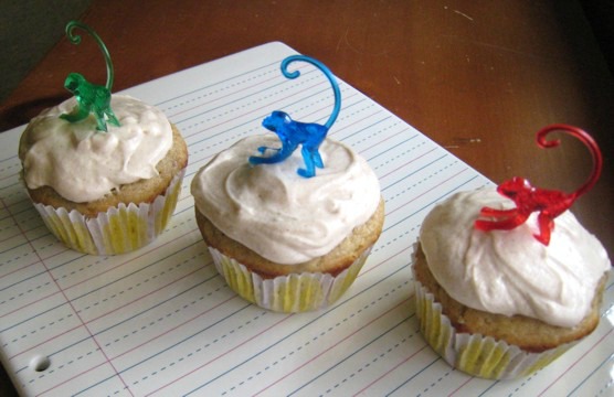 These banana cupcakes rocked – they were so delicious! And no, I haven’t made them yet – I’m still thinking about the perfect ones you brought over. The monkeys were a cute touch.