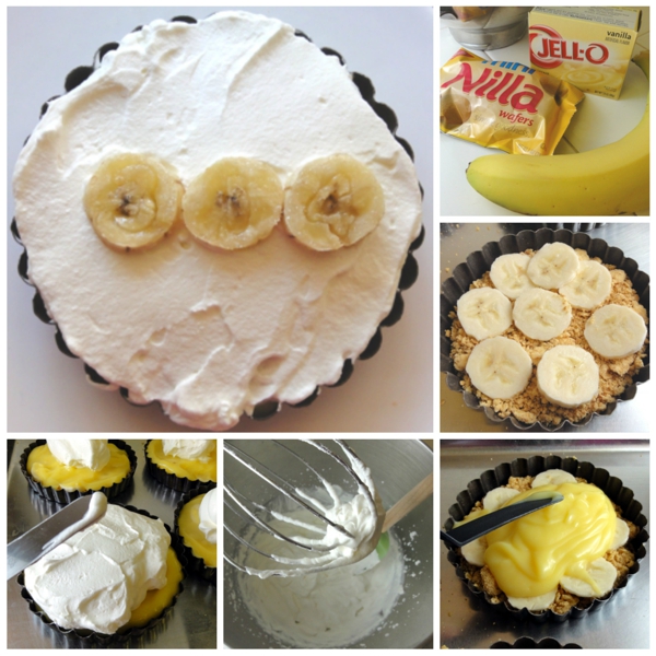 To make the crust, mix together the crushed Nilla Wafers with the butter. Press into six individual 4-1/2″ round pie pans.