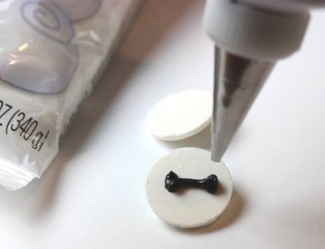 On the flat side of the candy melt with a #2 tip and black icing, pipe two circles, then a line connecting them.