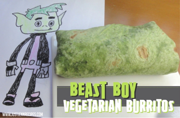 Beast Boy is always green and has the power to morphs into other animals. He’s is also a vegetarian. The Baby LOVES Beast Boy and after seeing the Burrito song, asked me to make burritos for dinner.