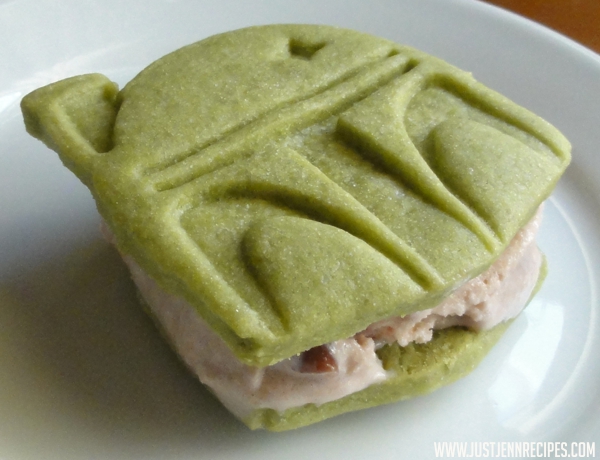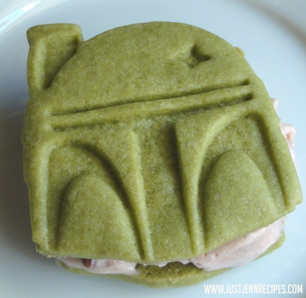 Since my kids were dressed as Boba Fett and Jango Fett for Halloween, it was a like a Fett family reunion at my house. What better way to pay homage to a family of bounty hunters than with a delicious cookie and ice cream dessert? Cool, creamy ice cream sandwiched between a green tea sugar cookie made with fierce Boba Fett cookie cutters. Make them for an afternoon snack or an all out Star Wars Party!