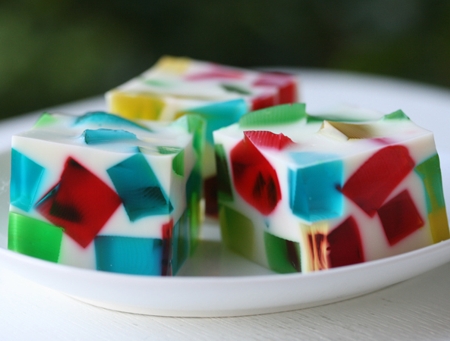 This looks like my childhood favourite jello but of course we used Agar-agar/Kanten. It has firmer texture than gelatine. Have you ever tried using it?