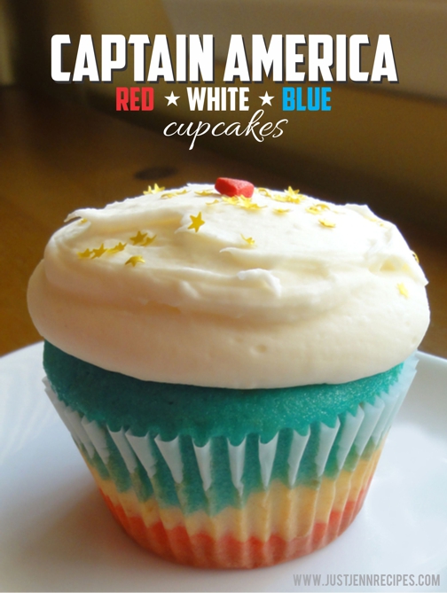 Inspired by Cap’s shield and all-American colors I decided to make red, white and blue cupcakes…CAPcakes! Frosted with vanilla buttercream and sprinkled with edible gold stars, one bite and you’re sure to become the next super-soldier!