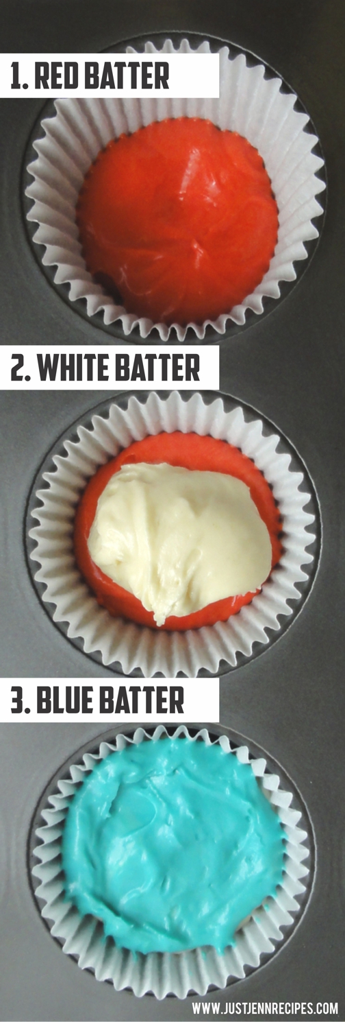 To the liners add a heaping Tablespoon of the red batter, followed by a Tablespoon of the white, then topping it off with a Tablespoon of the blue.