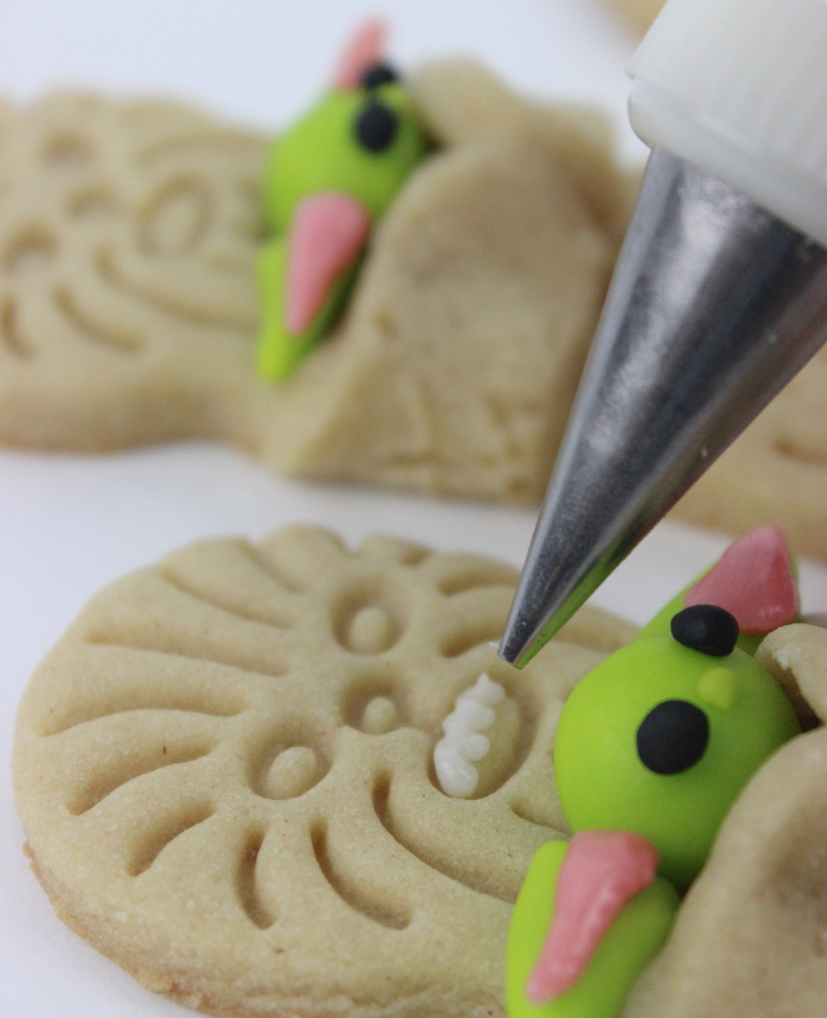 Step 13: With a #4 tip and black icing, add the eye details. Then use a #4 tip and white icing to add the teeth.