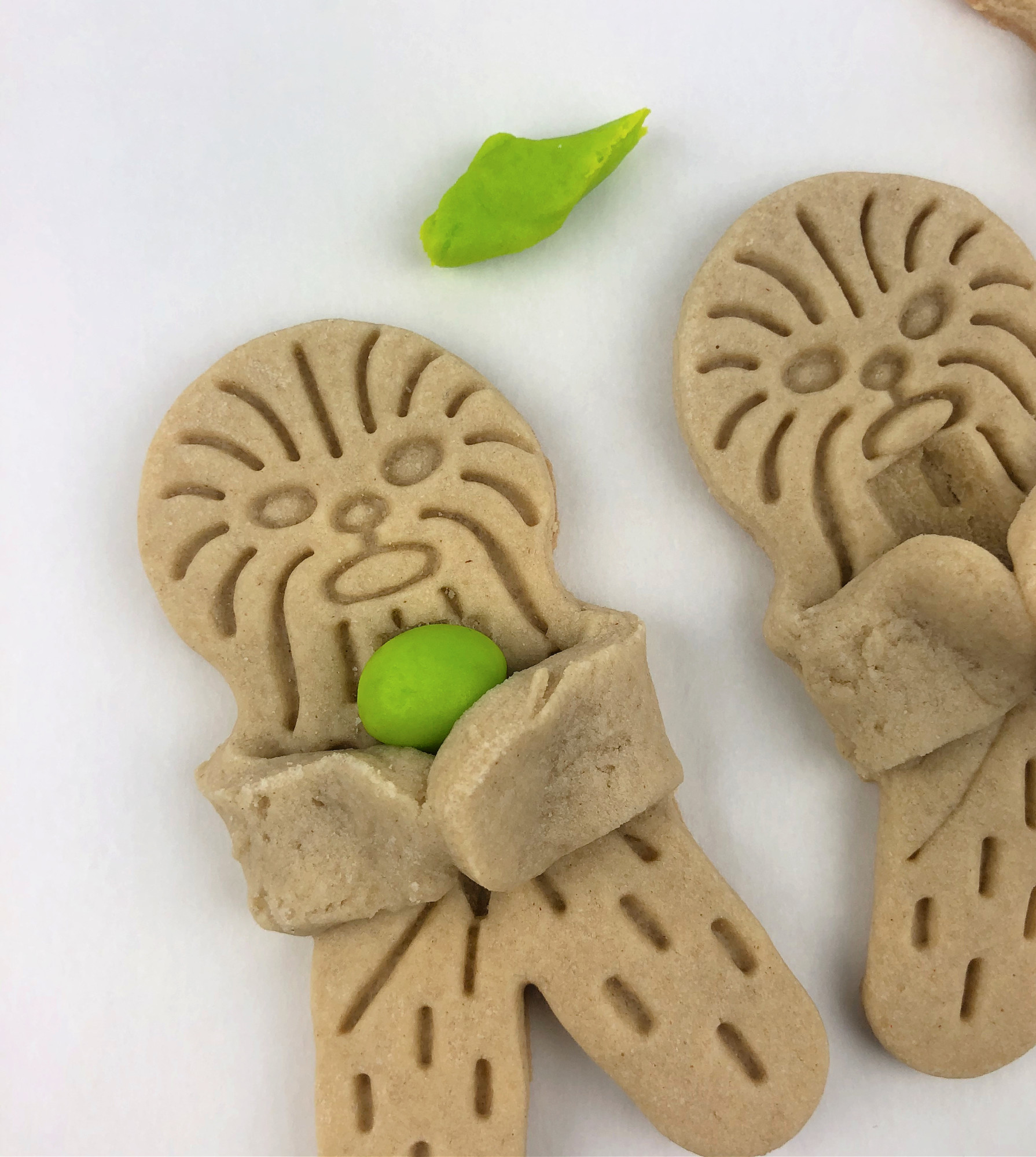 Step 9: Roll a small ball of green fondant to form the Child’s head. Add icing on the back to secure, and place in the Chewbacca cookie’s arms. Add a tiny piece of fondant for the nose.