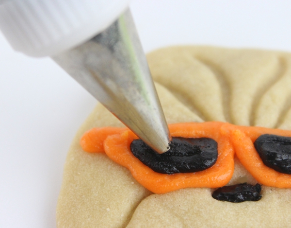 Onto the baked cookies, use orange icing and a #3 tip pipe the rim of the glasses onto Chewie’s face.