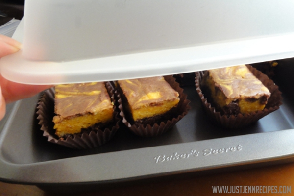 Whether it’s cutting your baked goods into squares right in the pan or putting them in festive baking cups, this pan makes it easy to take and deliver. I also like the idea of tying the whole thing up with a bow, treats and all, along with a recipe card and presenting the pan as a holiday gift.