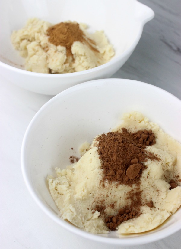 While the dough rises, make the topping. In a medium bowl, cream the sugar and butter, then stir in the flour and vanilla until the mixture is crumbly. Divide in two, stir the cinnamon into half the mixture, and the cocoa powder into the other. Set aside.