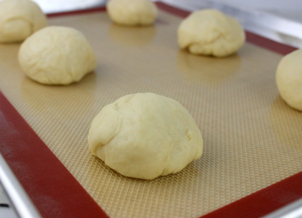 When the dough is done rising, punch down and cut into 12 even-sized pieces. Shape into flattened balls, and place on a baking sheet prepped with silpats or parchment, six per sheet.