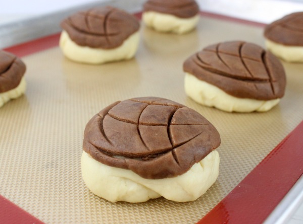 Divide each bowl of topping into 6 discs, scoring designs into the top to look like a shell. Place on top of the balls of dough, then cover and let rise for a second proof until doubled, about 45 minutes.