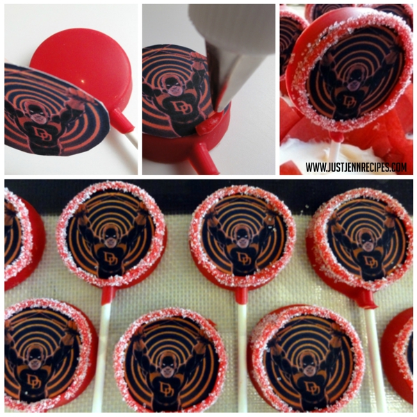 Place the edible image on the pops, then using a #5 tip, pipe an outline of red frosting around the image. Dip the pop into sanding sugar and let set.