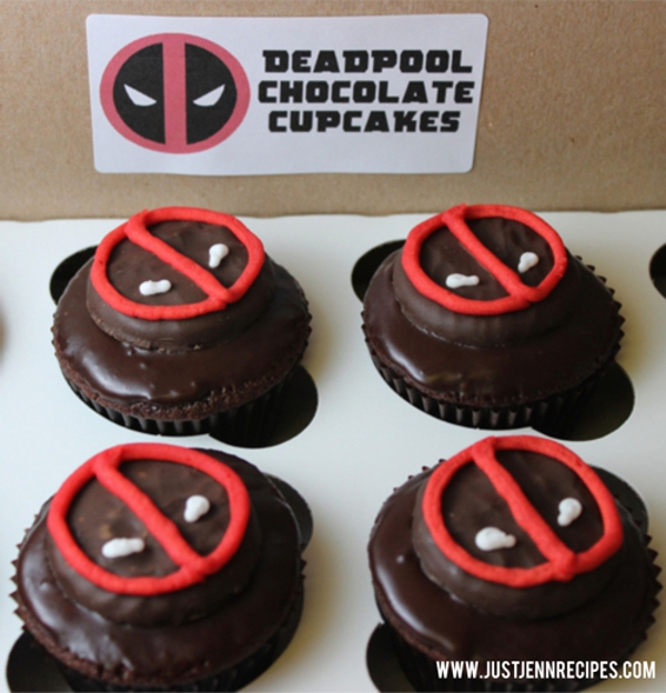 Dip the cupcakes into the ganache and top with Deadpool logo cookies.