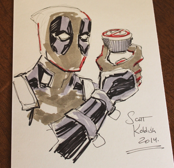 I went to a “wedding party” held at The Comic Bug to celebrate the release of the comic. Scott was on there to draw sketches and there was even an officiant on hand should anyone want to get married. No one took them up on the marriage thing but everyone was lined up for sketches! Scott was kind enough to draw me Deadpool holding a cupcake. Adorably deadly!