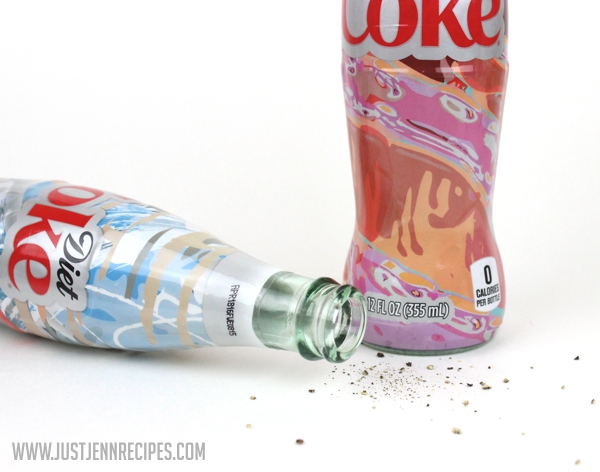 Once I drank the Diet Coke and the bottles were empty, rinsed and dried, I individually added condiments into each of them. One holds salt, the other pepper, both of which I use several times a day in my recipes.