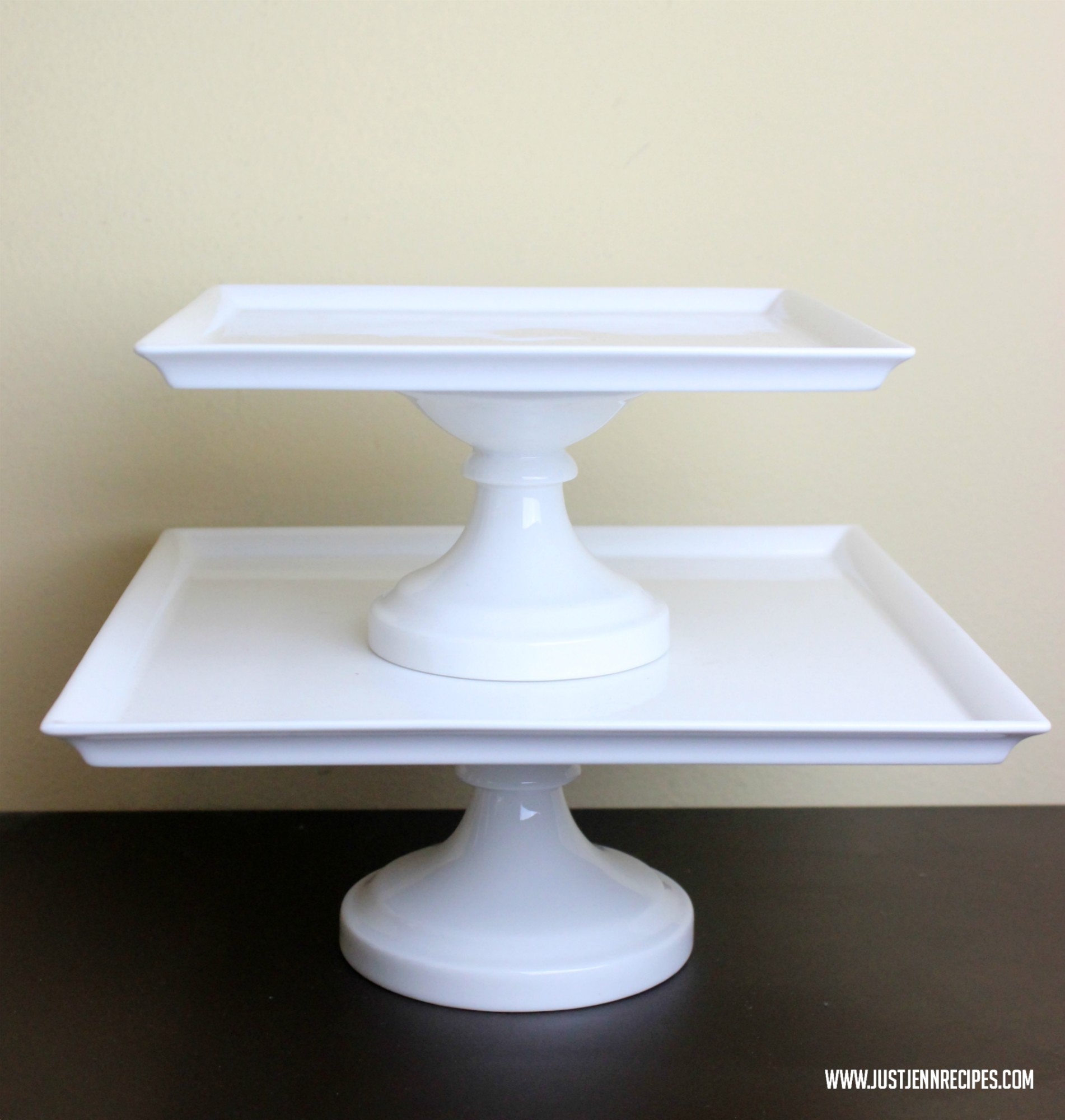 To start, you need a tiered tray, obviously. But don’t feel the need to run out and get one. You can make your own with plates and cups, or cake plates will do as well. I like the fact that these cake plates are separate so I can move them, allowing for more space around the base and different arrangements.