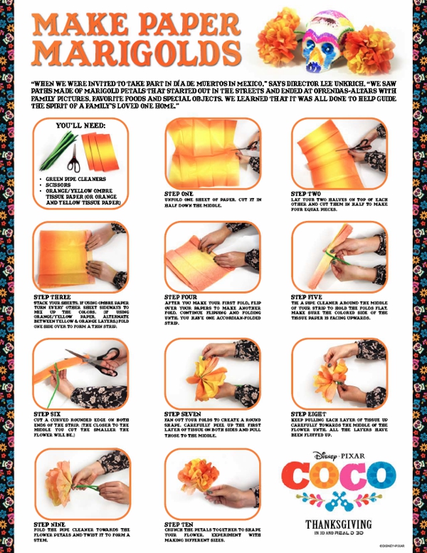 These Disney Coco activity sheets give instructions to make paper marigolds that resemble the flowers from the film, or create your very own homemade guitar so you can belt out “Remember Me,” just like Ernesto de la Cruz!
