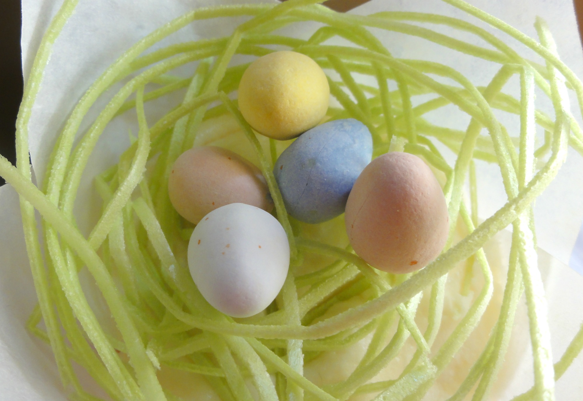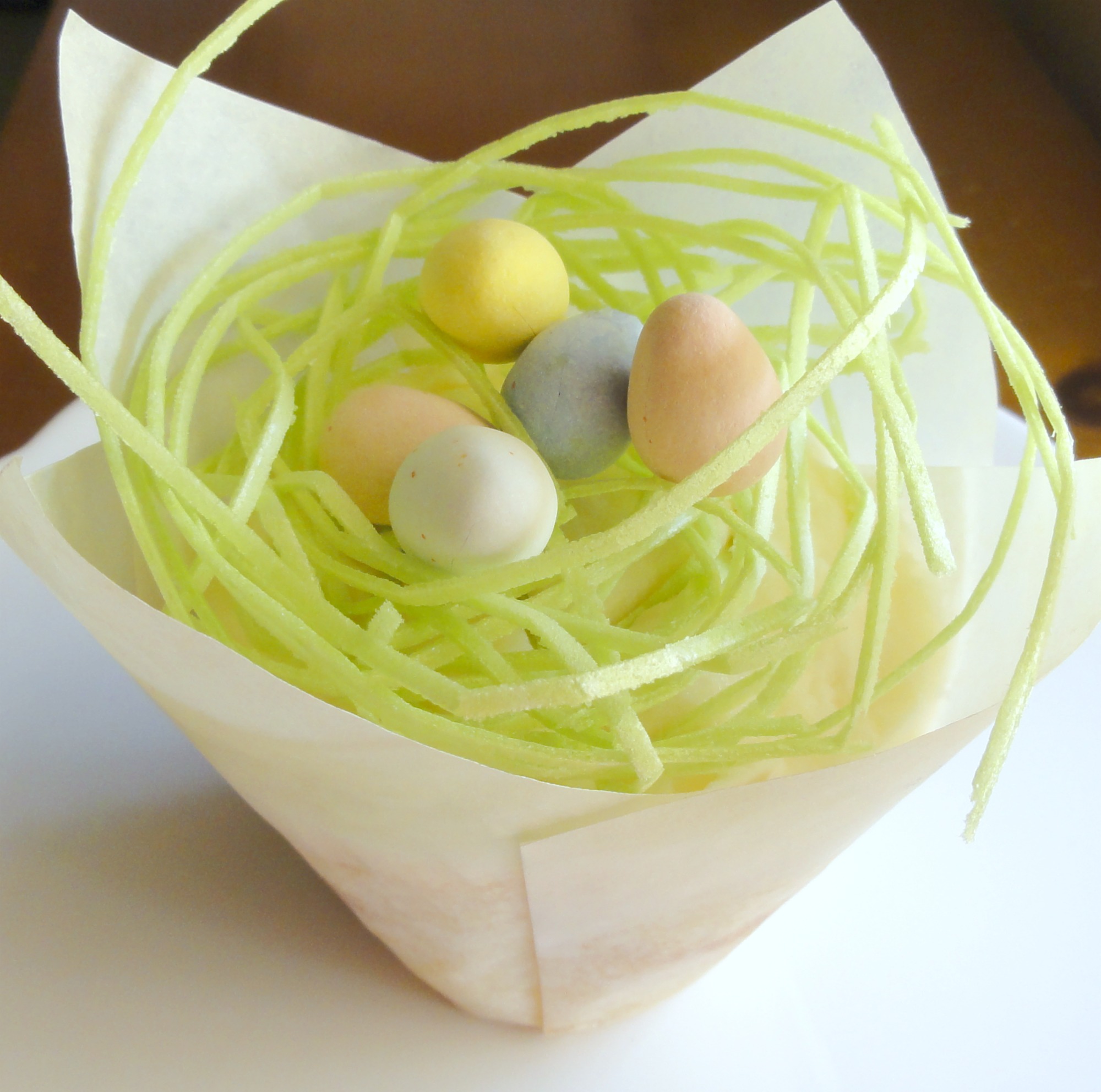 Step 1: Uncoil the edible grass. This is easier than it sounds, edible grass is hardly pliable. Shape into a small nest and place on top of the frosted cupcakes.