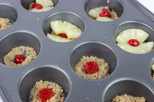 In a small bowl mix together the brown sugar and cinnamon. Distribute the mixture evenly among the prepped cupcake pan.