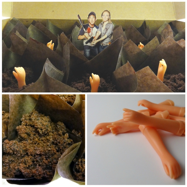 I took the idea of a zombie cupcake apocalypse and used baby doll arms as zombie stand ins. Yes they sell just the arms alone and yes, it’s sort of frightening to see a bunch of doll arms all over your counter.