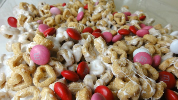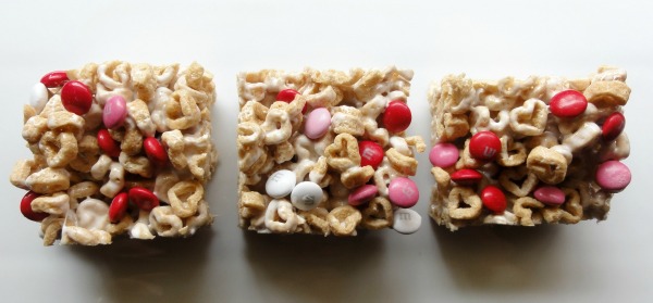 Press into the prepped pan and sprinkle the M&Ms on top. Add a few extra cereal hearts so the shapes are visible, if desired.