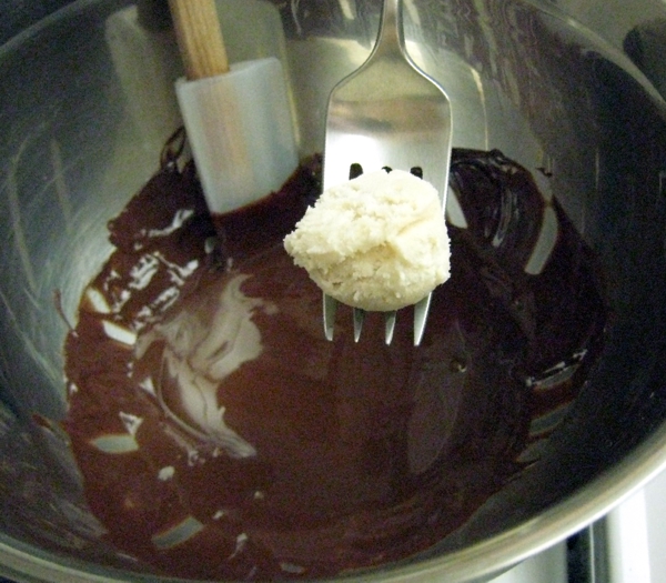 Let the chocolate cool slightly. Take the frozen ice cream balls out of the freezer. Using two forks, dip the ice cream balls into the chocolate, coating them completely. Work fast, the ice cream will start melting and the chocolate will start to harden before you know it. The tray may need to be put back in the freezer between dipping.