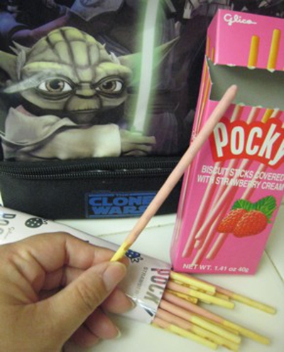 An alternative to Chocolate Pocky, good ‘ol Strawberry Pocky is a favorite of the Baby’s…and Yoda.