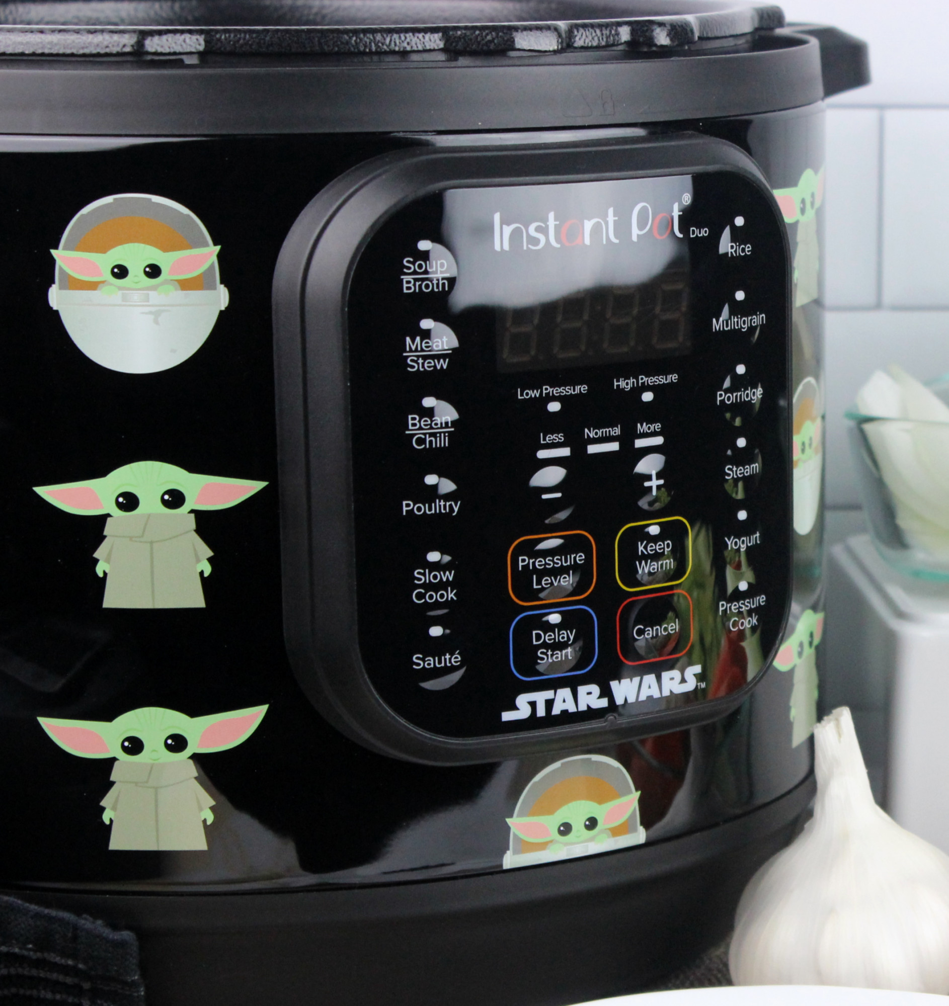 I’ll admit, I needed convincing when it came to the Instant Pot. I have so many kitchen appliances I really didn’t think adding another one would be of any use, (this from a woman who dumped her air fryer) but boy was I wrong. I’ve used mine about twice a week since I got it and it’s been amazing. I’ll admit having The Child as decoration on the Instant Pot was a big plus too.