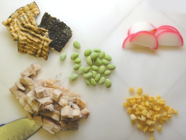 Pour the soup broth into a bowl, add the noodles and top with chicken, edamame, sweet corn, kamaboko and nori chips. The beauty of this is that you can customize it to your taste. I even added gyoza because I had a few in my freezer! If you like a little spice, add some ichimi togarashi (Japanese chili powder) and season to taste.