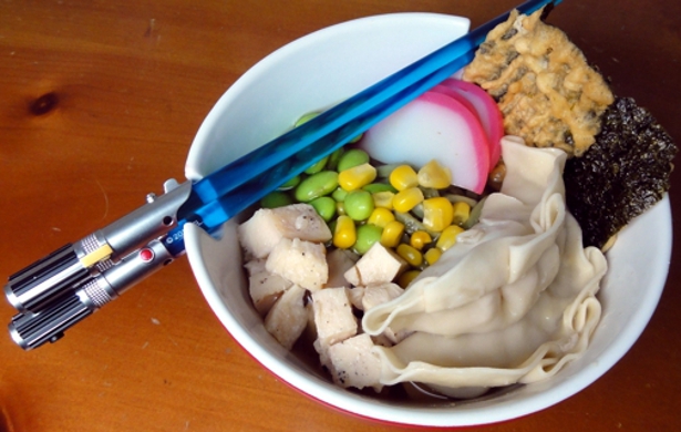 This is a light soup, perfect for a cold day or…an 80 degree winter day at the beach. One thing’s for certain, lightsaber chopsticks definitely make this meal taste better. Definitely.