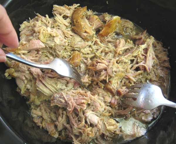 Once the 16 hours is up shred the pork using two forks incorporating the juices.