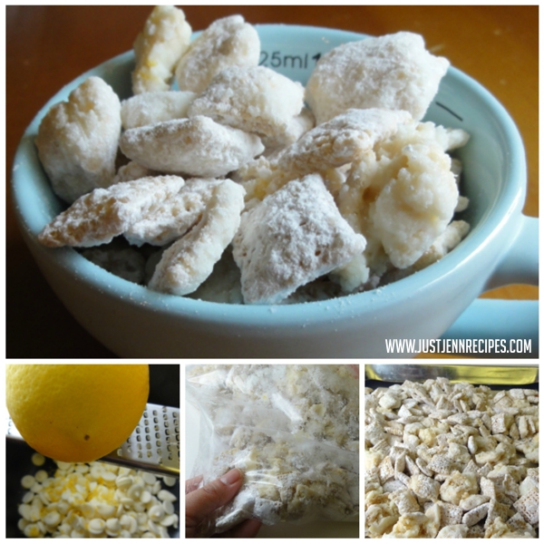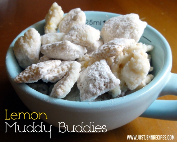 I love peanut buttery Muddy Buddies but now that my Kid has an aversion to peanut butter I thought I’d come up with a different way of presenting the sweet snack. A bounty of fresh lemons came my way and since I’ve been adding it to everything, I thought I’d try it in Lemon Muddy Buddies. Success! Lemon lovers will adore this sweet and crunchy, citrus treat!