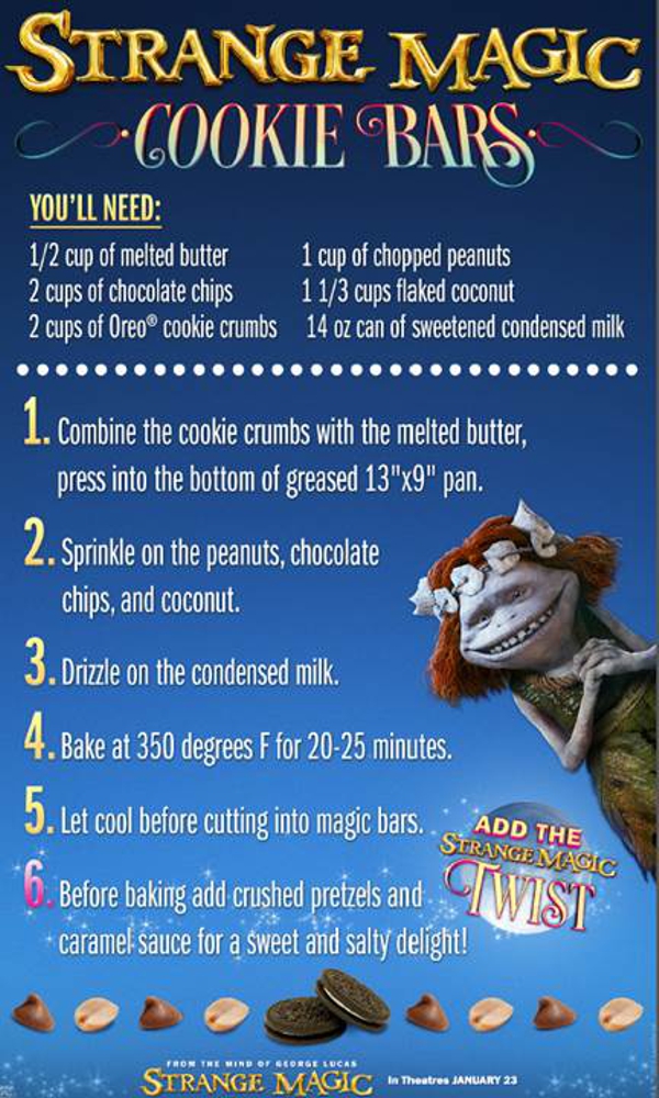 Let’s celebrate this extraordinary movie from Lucasfilm the right way, with food! Here are four inspired recipes from Strange Magic along with a musical moment clip. Strange Magic opens in theatres everywhere on January 23rd. Enjoy!