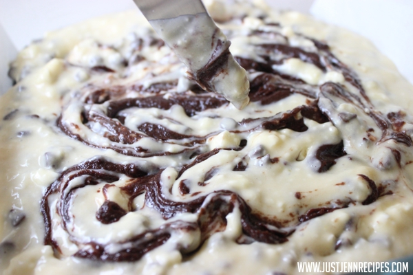 Pour the chocolate batter (saving one cup) into the prepared pan. Spoon the cream cheese mixture over the chocolate, then dollop the reserved one cup of chocolate batter on top. Using a knife, swirl the cream cheese mixture on top.