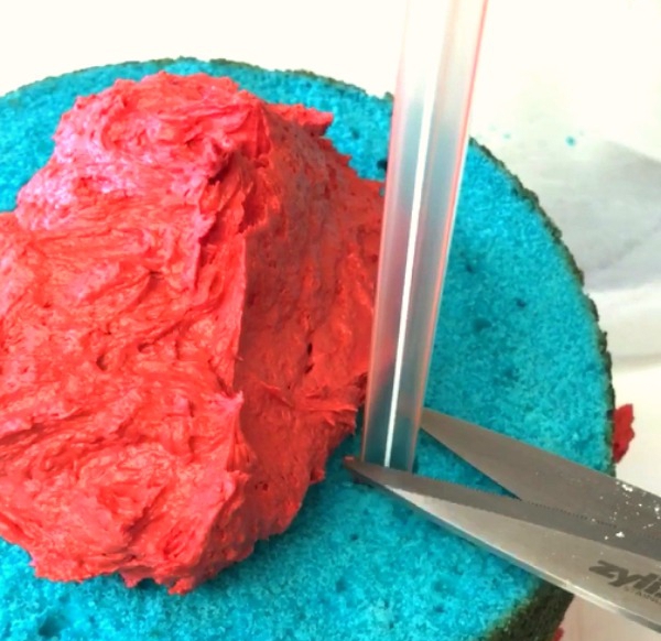 Level out the cakes, then stack and frost. Insert straws to stabilize the cake.