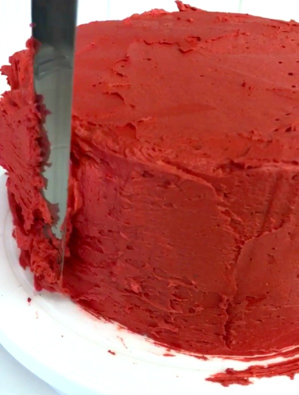 While the cakes are cooling, start the frosting. In the bowl of an electric mixer beat the butter, then slowly add the powdered sugar. Add the vanilla, red food gel dye, and milk. Add more milk as needed to get the desired consistency.