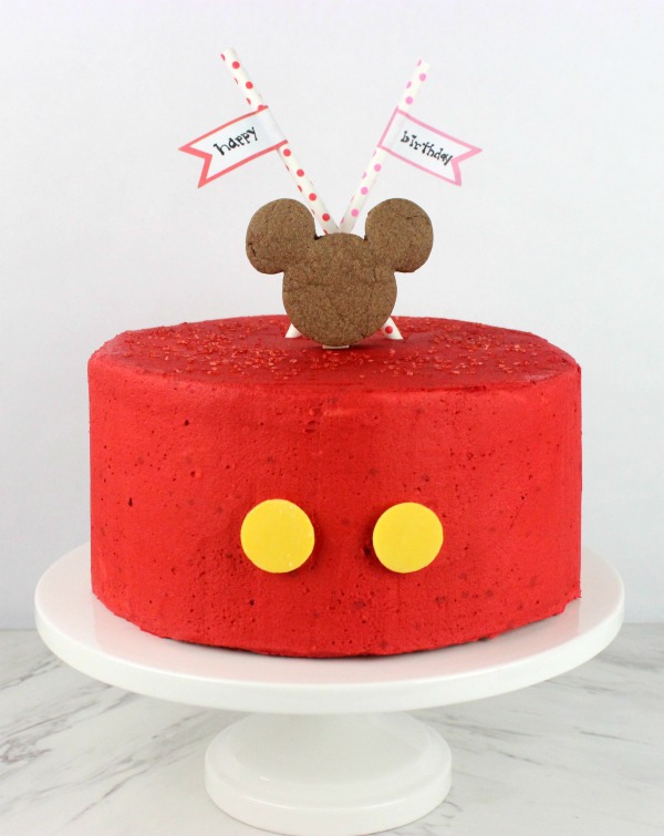 Sprinkle red sanding sugar on the top of the cake, then decorate with Mickey cookies and banners to serve.
