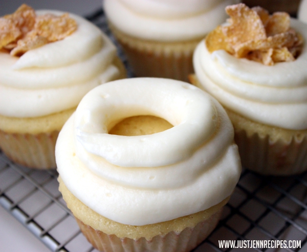 Wake up in the morning, shuffle into the kitchen, crack your eyes open to find your favorite box of cereal. Prize? No prize? Either way there’s nothing more comforting than milk and cereal for breakfast. The combination is pure heaven so obviously I had to put it into a cupcake!