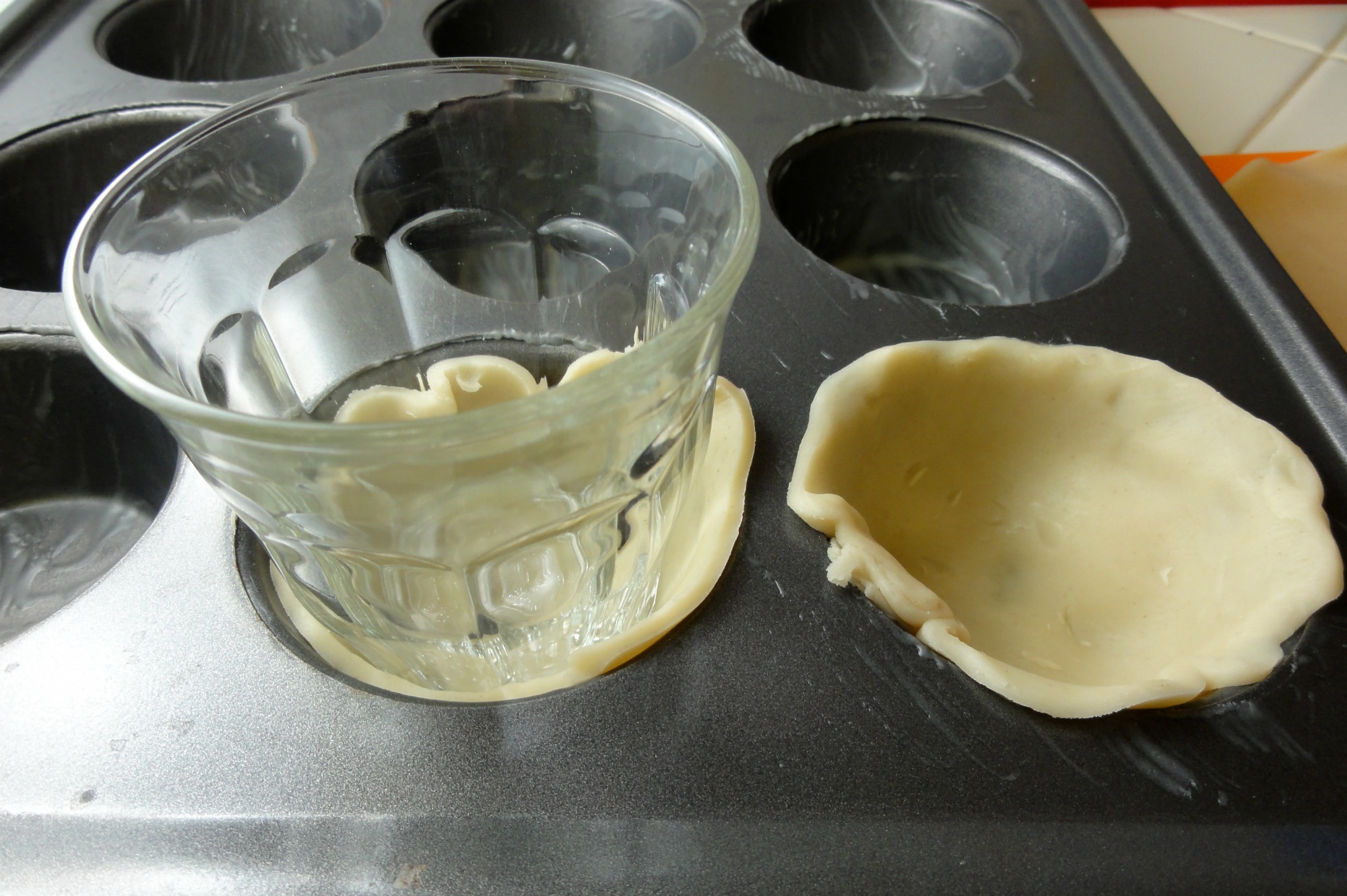 Step 8: Roll out one batch of pie dough and cut out 5-inch circles. Press them into the greased muffin tins, using the bottom of a small glass. Set aside.