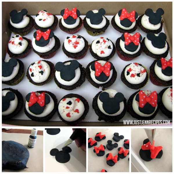 Lay the bows on the black Mickey heads and suddenly Minnie will start to come to life! To finish, use a #2 tip, pipe white icing dots onto the bows and place on top of frosted cupcakes.