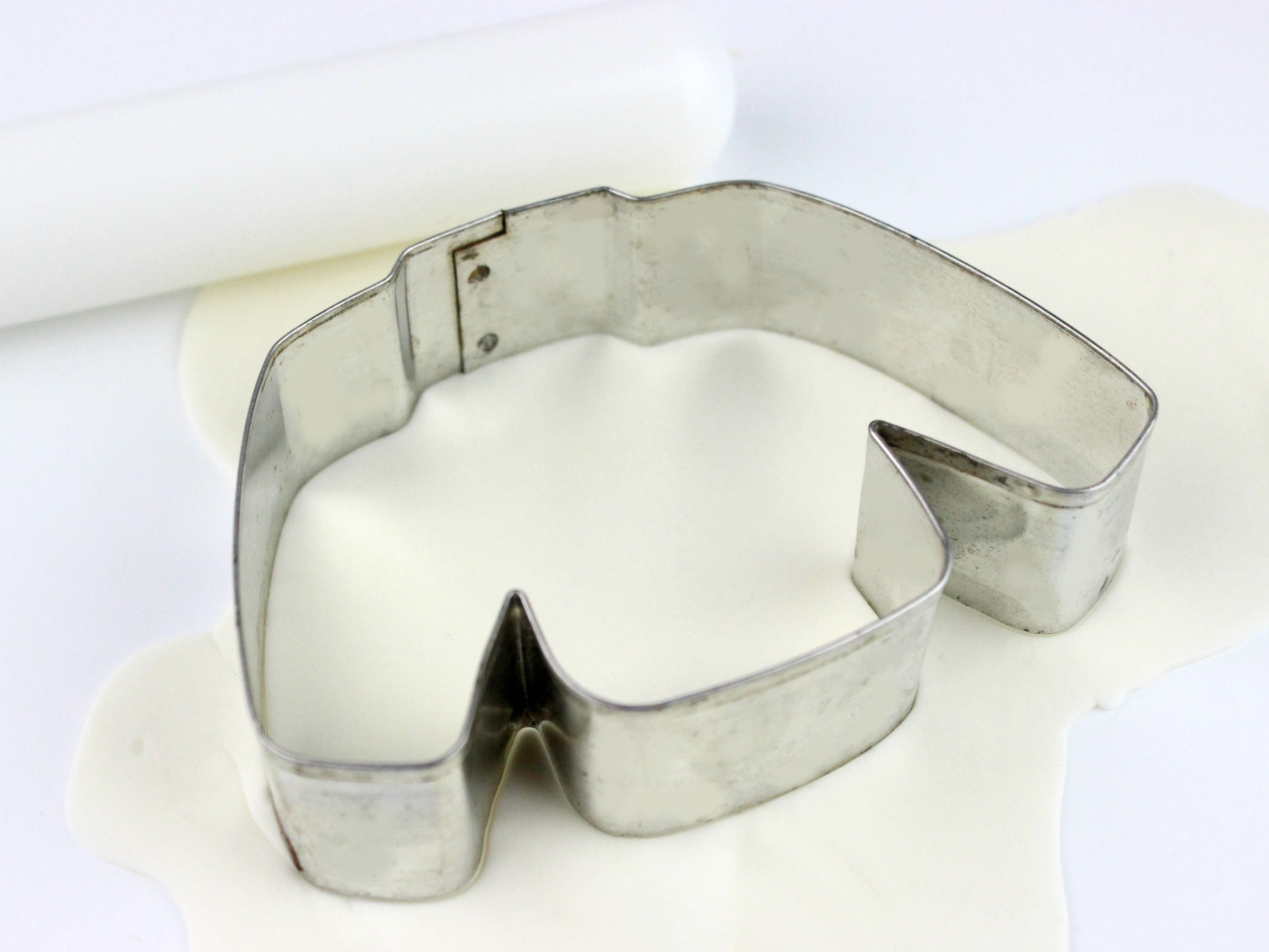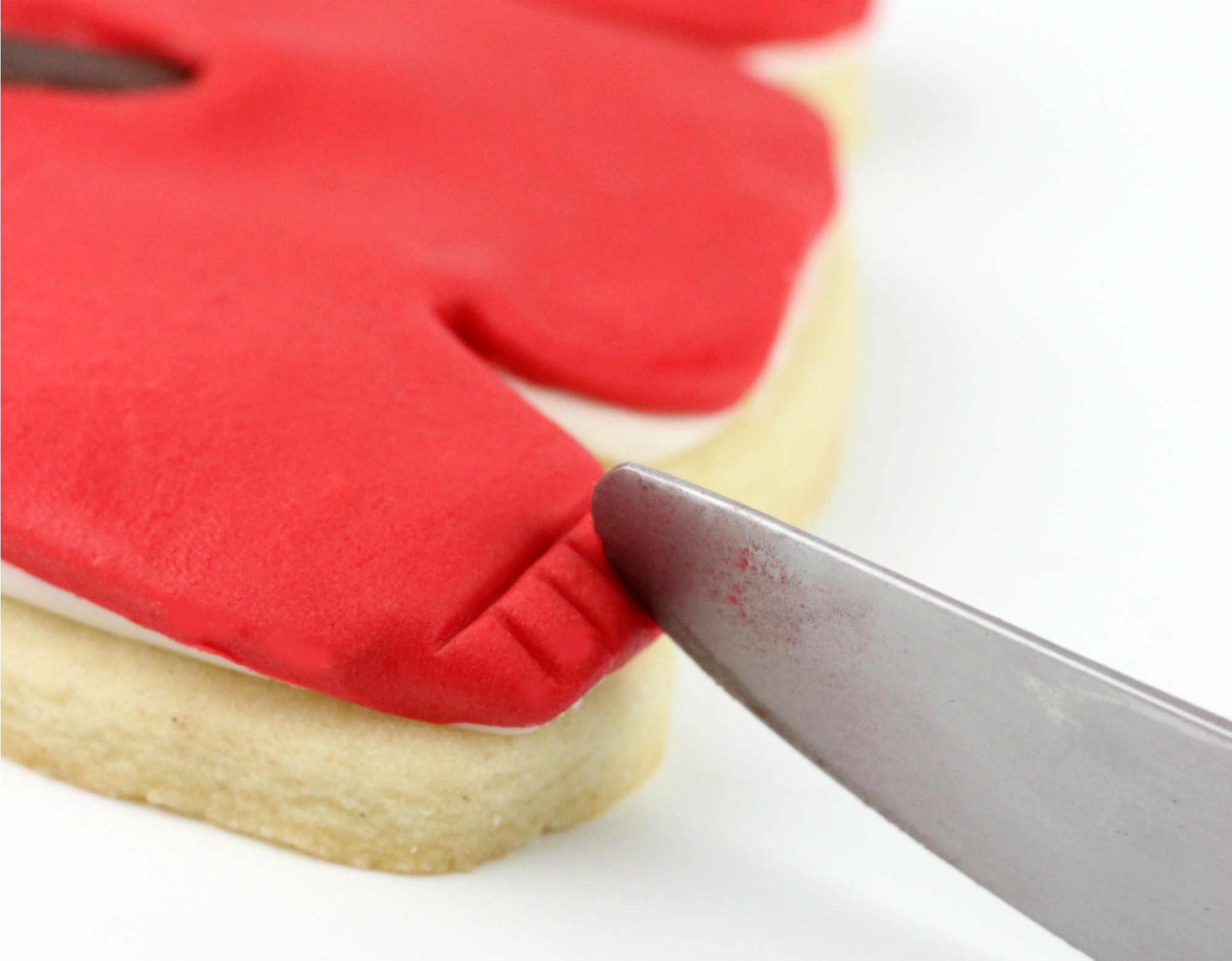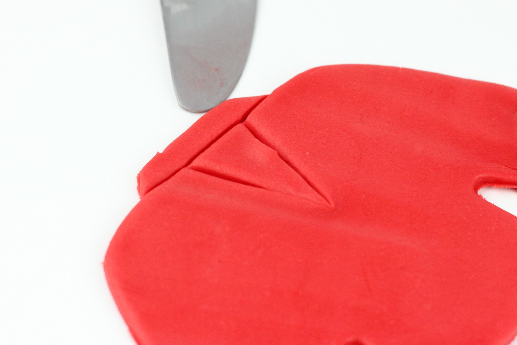 Step 12: Roll out the red fondant, use the cookie cutter to cut out the shape. Use a knife to cut a v-neck shape into the center. Place on top of the cookie.