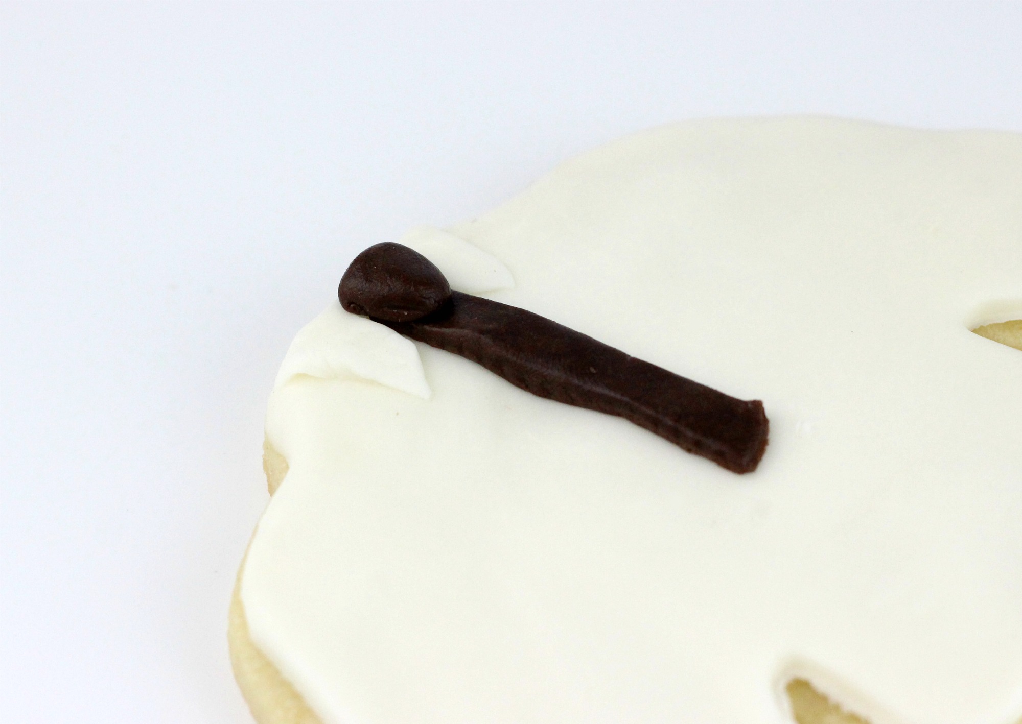 Step 10: Spread icing onto the cookie, then lay down the white fondant.