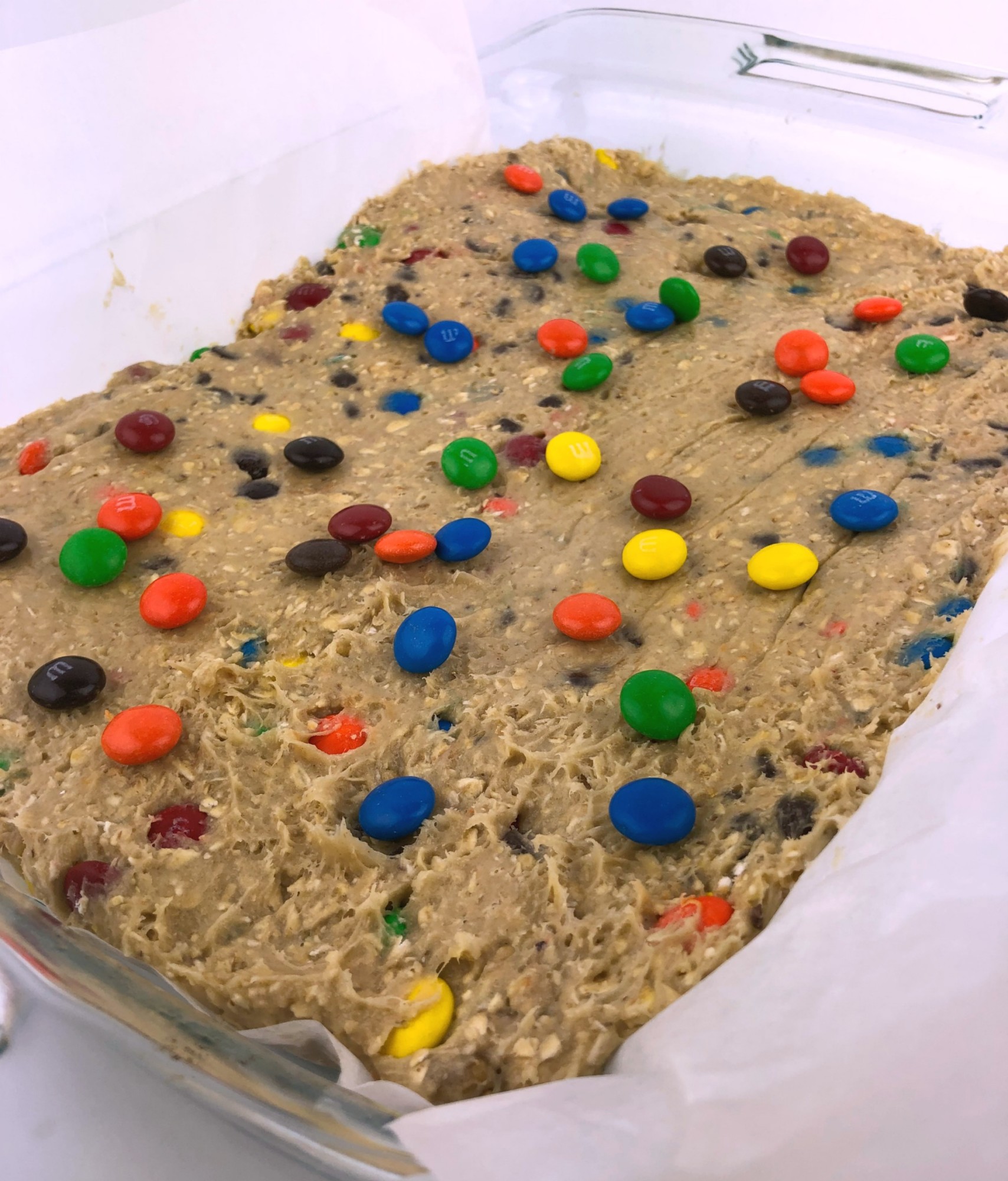 Step 6: Press the dough into the prepped pan. Sprinkle with the rest of the M&Ms.