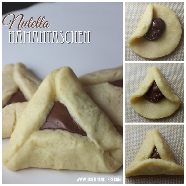 Hamantaschen are traditionally filled with poppy seed or prune filling but I like to fill mine with Nutella! Everything’s better with Nutella and it seems like a match made in heaven for hamantaschen. The real secret to good hamantaschen? It’s all in the folding…