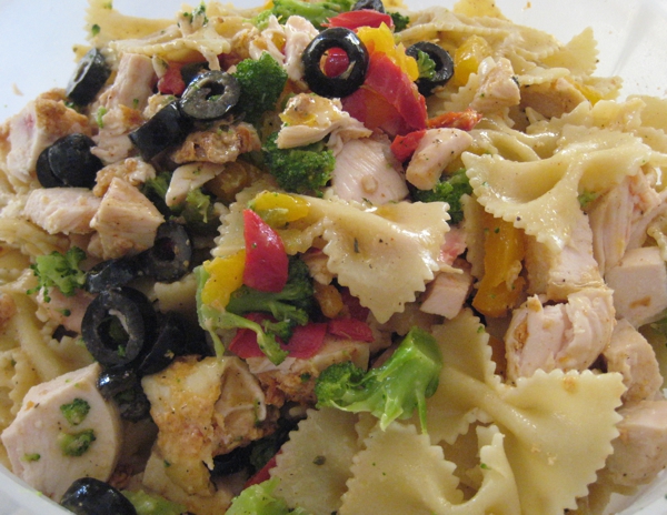 In a large bowl toss the pasta, broccoli, peppers, olives and chicken.