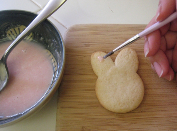 Combine the powdered sugar and water, adding a touch of pink gel dye to get a soft pink. Use a clean pastry paintbrush and paint the bunny ears.
