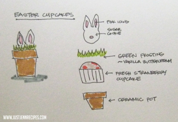 Easter is a big family gathering for us. With so much food and egg hunting there’s always a lot to eat but an adorable dessert is too good to pass up. Going with a bunny theme I sketched some ideas and settled on using both cookies and cupcakes. After all, you can’t go wrong with two desserts!