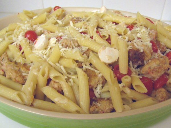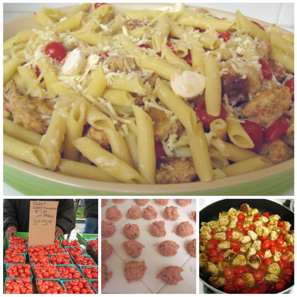 Well, I didn’t exactly make the meatballs part, but this dish tasted good using Amylu chicken sausages. We recently shopped at Costco and had a bunch of stuff needing to be used: grape tomatoes, mozzarella balls, large container of grated Grana Padano, and the sausage. Lots of basil left in the garden, and with fall coming, they need to be used up soon. This recipe was perfect for what I had around the house today and not being in the mood to go food shopping. Thanks, Jenn!